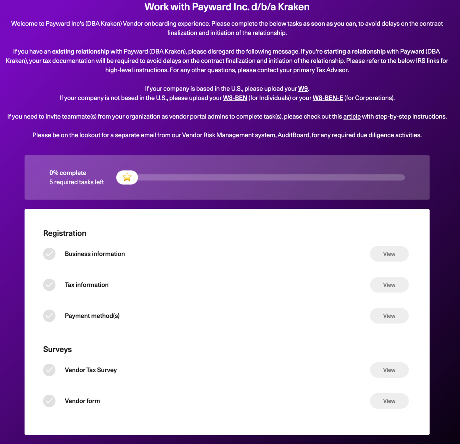 Nếu bạn cần cập nhật thông tin công ty (ví dụ: địa chỉ, mã số thuế, thông tin ngân hàng), vui lòng gửi email cho người liên hệ chính của bạn từ Payward và đội ngũ Kế toán phải trả (A/P) của Payward. A/P sẽ khởi tạo quy trình xác thực lại và gửi lời mời truy cập cổng thông tin mới.